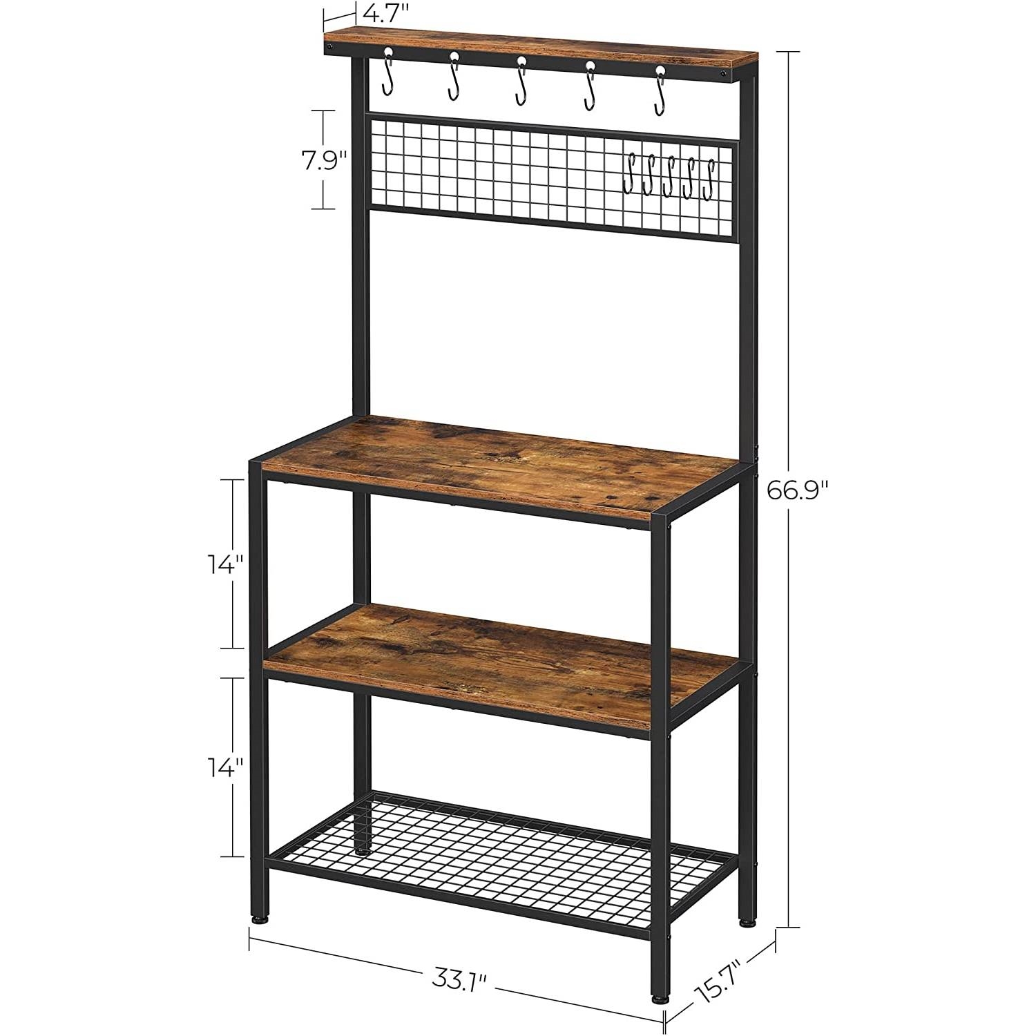 This 3-Shelf Black Metal Rustic Brown Wood Kitchen Baker's Rack Microwave Stand would be a great addition to your home. Specifications: - Color: Rustic Brown, Matte Black - Material: Particleboard, Iron - Total Size: 33.1"L x 15.7"W x 66.9"H (84 x 40 x 170 cm) - Product Weight: 39.6 lb (18 kg) - Max. Static Load Capacity of Each Wooden Shelf: 66 lb (30 kg) - Max. Static Load Capacity of Metal Mesh Shelf: 44 lb (20 kg) - Max. Static Load Capacity of Each Hook: 6.6 lb (3 kg) - Max. Static Load Capacity of Top Narrow Shelf: 22 lb (10 kg) Package Contents: - 1 x Kitchen Shelf - 10 x Hook - 2 x Anti-Tip Kit - 1 x Accessory Bag - 1 x Instructions Notes: - Avoid long time exposure to strong sunlight. - Avoid contact with sharp or pointed objects. - Please do not place overweight items on the product. - Please fix the product to the wall with the anti-tip kit. If all of these are essential items for you, don’t worry! Strong steel frame and quality 15 mm thick chipboard have the strength, so you can put nearly all you need on this kitchen shelf. Place pots on the 3 shelves, customize the mesh panel by hanging cups and potholders, leave ladles and spatulas on the top hooks, and use the top narrow shelf for spice jars—now it's up to you! You don’t need to an expert on the assembly of this kitchen shelf, as it comes with numbered parts and step-by-step instructions to make it easy-peasy.
