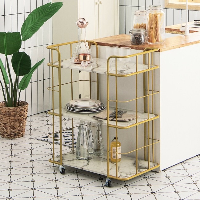 This 3 Tier Faux Marble Gold Rolling Bar Cart offers sufficient storage for food, wine, beverage, tableware and so on, which can well satisfy your storage needs. It's designed with beautiful gold frame and faux marble finish, which brings a touch of elegance to any room of your house. The kitchen utility cart is equipped with four 360° swiveling casters for smooth rolling, including two casters with brakes. Made of rust-resistant steel and high-quality MDF, the serving cart is solid and durable. Each shelf can bear a weight up to 55 lbs.